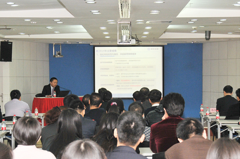 張總裁在會議上做了2014年年度工作報告及2015年工作安排,全面客觀地回顧了一年來公司各項工作進展情況,發(fā)現(xiàn)問題,總結(jié)得失,并根據(jù)戰(zhàn)略規(guī)劃部署了新一年重點工作任務(wù)。2014年是公司進行戰(zhàn)略轉(zhuǎn)型的第一年,在“抓住機遇、提質(zhì)增效”的指導(dǎo)思想下,圍繞抓好融資結(jié)構(gòu)升級和風控手段創(chuàng)新兩個著力點,加快干部隊伍建設(shè)梯隊化和年輕化步伐,構(gòu)建了“業(yè)務(wù)行業(yè)化、融資多元化、風控專業(yè)化”的經(jīng)營新格局。