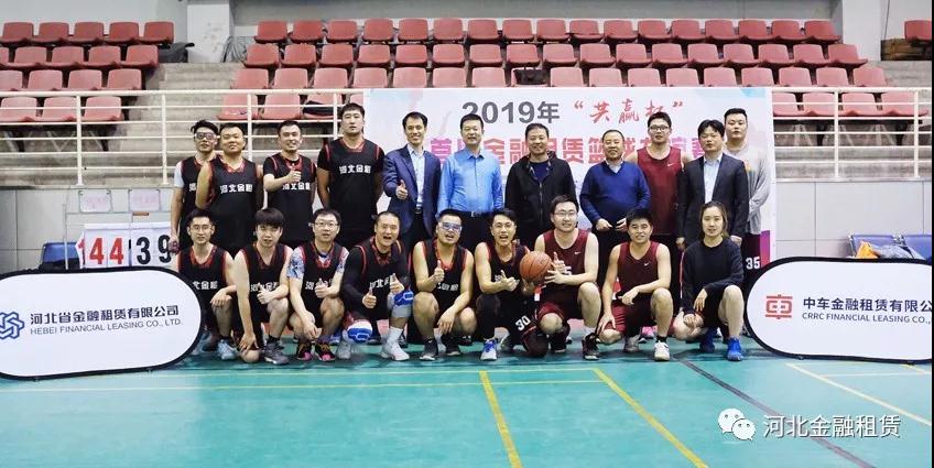 ▲河北金租董事長徐敏?。ê笈庞椅澹?、監(jiān)事長肖剛(后排右六)、副總裁李永德(后排右七)、工會主席石拴江(后排右四)等與籃球隊合影。