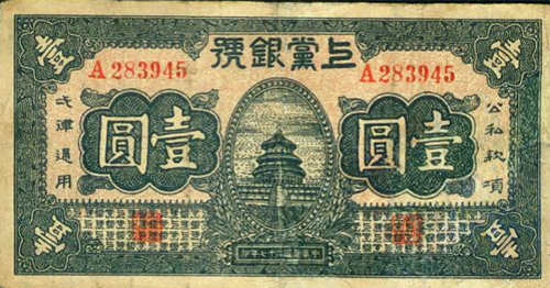 1938年,為了獨立自主地發(fā)展和鞏固根據(jù)地,嚴防蔣介石、閻錫山經(jīng)濟封鎖,晉東南抗日根據(jù)地在沁縣成立上黨銀號,發(fā)行“上黨票”。上黨票初發(fā)行時與法幣、晉鈔、銀元以及根據(jù)地各縣銀號發(fā)行的縣票同時流通于晉東南、晉南、晉中、冀南等部分縣域,1938年發(fā)行的面額有拾元、伍元、貳元、壹元、伍角、貳角伍分、貳角、壹角等8種票面10種版別。壹元票的主圖設(shè)計為體現(xiàn)根據(jù)地貨幣特色,天壇主圖的下面倒印有一“黨”字暗記。1940年初,“上黨銀號”結(jié)束,其財產(chǎn)并入“冀南銀行”時,共發(fā)行上黨票300余萬元。
