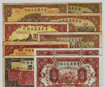 晉察冀抗日根據(jù)地,是中國共產(chǎn)黨在抗日戰(zhàn)爭時期于敵后開創(chuàng)的第一個抗日根據(jù)地。晉察冀邊區(qū)政府于1938年2月成立晉察冀邊區(qū)銀行,在山西五臺縣石咀鄉(xiāng)的普濟寺內(nèi)開始營業(yè)。邊區(qū)銀行的貨幣發(fā)行后,清除了地方發(fā)行的各種鈔票,統(tǒng)一了邊區(qū)的貨幣市場,支持了抗日戰(zhàn)爭,支持了生產(chǎn),改善了人民生活,深受抗日根據(jù)地軍民的歡迎。晉察冀邊區(qū)票當時在山西、河北、察哈爾省、熱河省以及遼寧西部、內(nèi)蒙古、山東德州地區(qū)等敵后抗日根據(jù)地流通,流通人口達3000多萬人。直到1948年晉察冀邊區(qū)銀行與冀南銀行合并,成立華北銀行,晉察冀邊區(qū)票才停止流通使用。