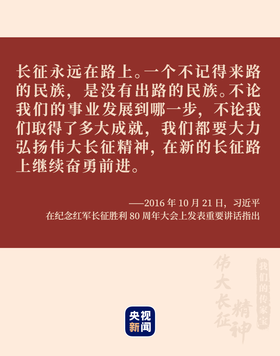 2016年10月,習(xí)近平總書記在紀(jì)念紅軍長征勝利80周年大會上指出,震撼世界、彪炳史冊的長征,宣告了國民黨反動派消滅中國共產(chǎn)黨和紅軍的圖謀徹底失敗,宣告了中國共產(chǎn)黨和紅軍肩負(fù)著民族希望勝利實(shí)現(xiàn)了北上抗日的戰(zhàn)略轉(zhuǎn)移,實(shí)現(xiàn)了中國共產(chǎn)黨和中國革命事業(yè)從挫折走向勝利的偉大轉(zhuǎn)折,開啟了中國共產(chǎn)黨為實(shí)現(xiàn)民族獨(dú)立、人民解放而斗爭的新的偉大進(jìn)軍。