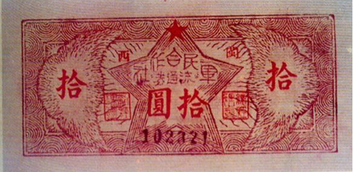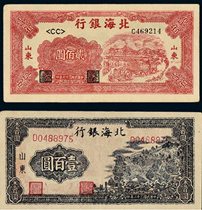 在抗戰(zhàn)勝利結(jié)束時(shí),山東解放區(qū)已有極大發(fā)展,有12.5萬(wàn)平方公里的面積,占山東總面積的92%,擁有2400萬(wàn)人口,占山東總?cè)丝诘?0%。1948年10月,山東的北海銀行幣與華北的冀南銀行幣、晉察冀邊區(qū)幣固定比價(jià)互相流通,1948年11月16日起,北海銀行幣與華中銀行幣等價(jià)流通。這一時(shí)期的北海銀行幣均不加蓋地名,便于山東以外的地區(qū)流通。1948年12月1日,華北銀行、北海銀行、西北農(nóng)民銀行合并,在石家莊成立中國(guó)人民銀行,但因工作的需要,北海銀行繼續(xù)營(yíng)業(yè),1949年1月底開始回收北海銀行幣,同年11月1日改稱中國(guó)人民銀行山東分行,至此,北海銀行完成了它的歷史使命宣告結(jié)束。