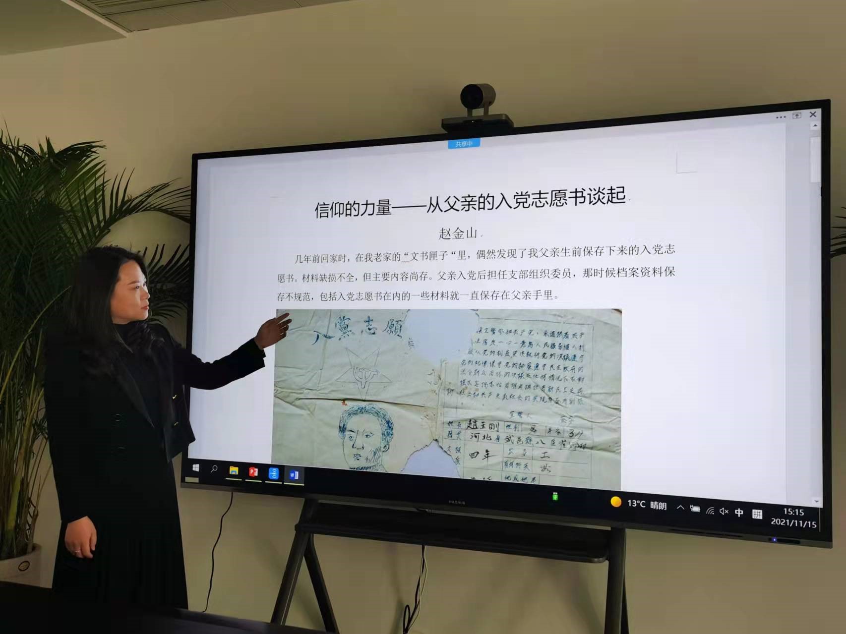 大家還研讀了趙金山同志的文章《信仰的力量——從父親的入黨志愿書談起》,在文中我們看到了趙金山同志的父親趙玉剛同志的《入黨志愿書》,這份《入黨志愿書》由中共冀南武邑縣委組織部印制,歷經(jīng) 60 多年歲月,雖已殘破,但圖案和字跡依然清晰,是非常寶貴的文獻資料。在了解了這份《入黨志愿書》的故事和趙玉剛同志的生平事跡后,大家被這種信仰堅定、忘我奉獻、吃苦在前、享受在后的精神所打動,表示一定要繼承老一輩共產(chǎn)黨員的光榮傳統(tǒng),在公司戰(zhàn)略轉(zhuǎn)型的關(guān)鍵時期勇挑重擔,踐行使命-----這是我們每個共產(chǎn)黨員的責任。