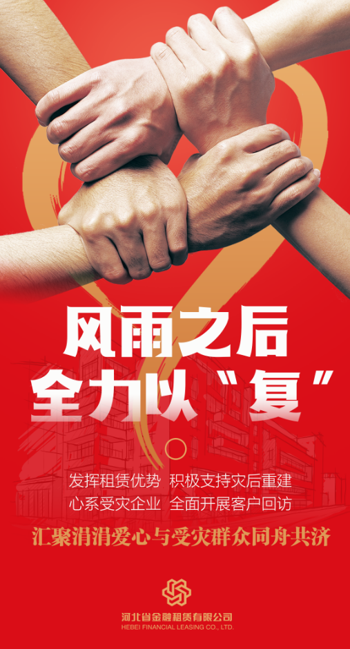 風雨之后,是災后重建的關鍵時期。河北省金融租賃有限公司(以下簡稱“河北金租”或“公司”)全力落實各級政府及監(jiān)管部門的決策部署,及時出臺針對性政策,迅速投身災后重建工作,積極幫助受災地區(qū)企業(yè)解難紓困,以實際行動踐行金融工作的政治性、人民性。