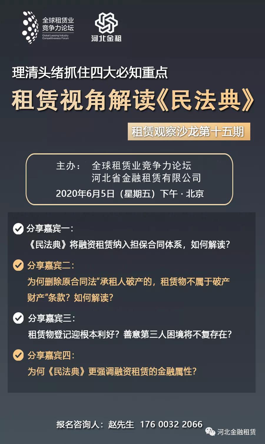 《中華人民共和國民法典》近日正式公布,標(biāo)志我國“民法典時(shí)代”到來。《民法典》涉及多項(xiàng)與融資租賃密切相關(guān)的法律條款,擴(kuò)大了動(dòng)產(chǎn)擔(dān)保合同的范圍,將融資租賃納入擔(dān)保合同,將對融資租賃業(yè)的經(jīng)營活動(dòng)產(chǎn)生深遠(yuǎn)影響。 6月5日下午,全球…